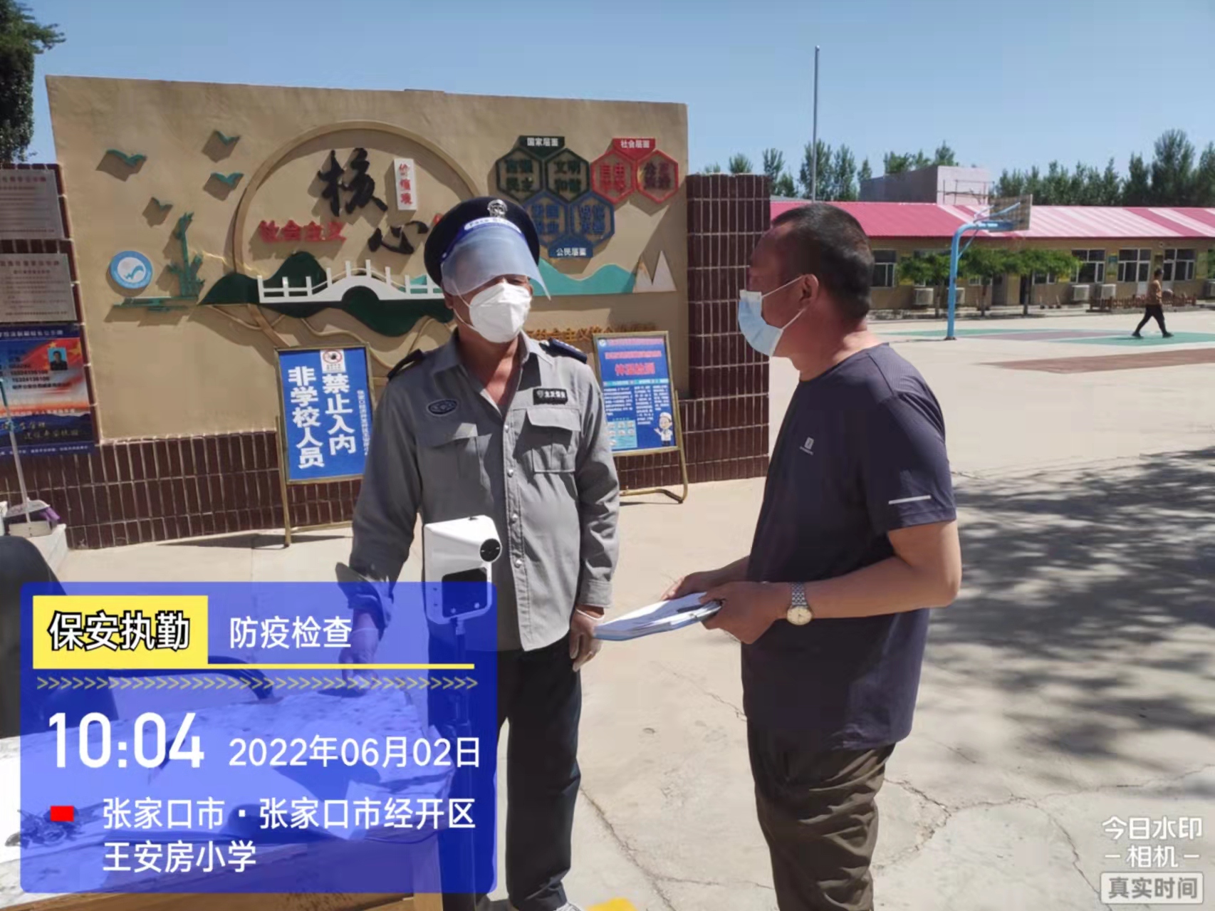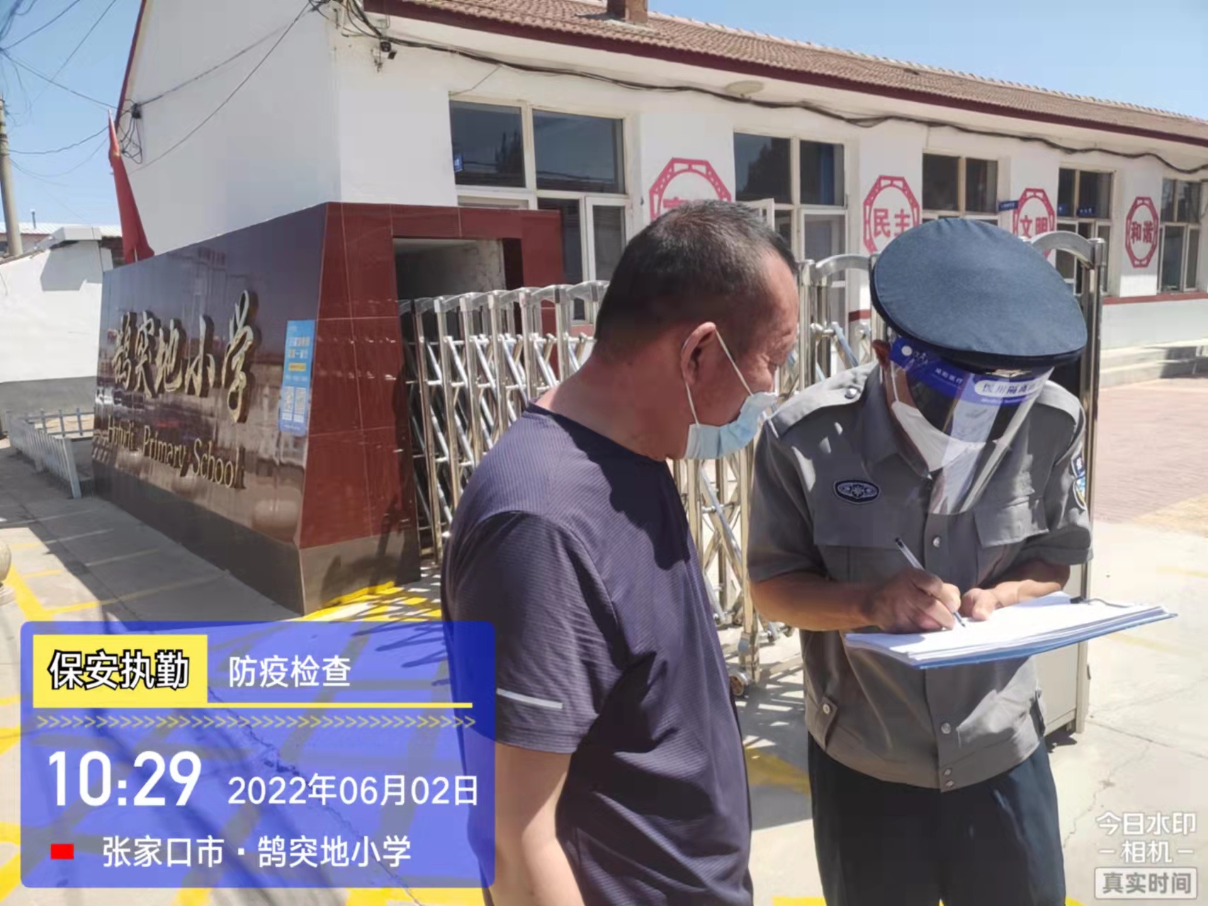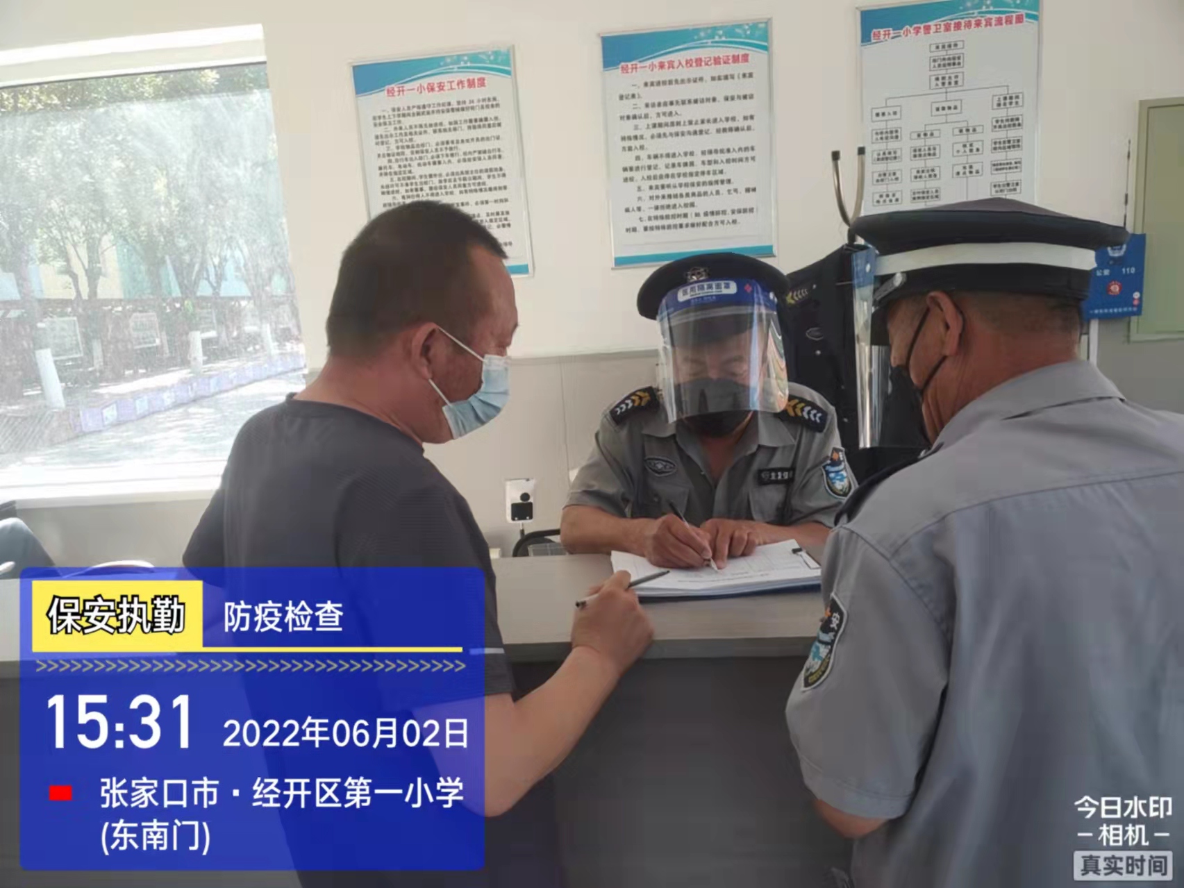 會后,我公司迅速召開“疫情期間學(xué)校門衛(wèi)安全防控工作要求”的會議,制定了校園安全防疫規(guī)定:疫情防控期間,校園保安隊員必須穿制服,規(guī)范佩戴“三件套”(防護隔離面罩、N95口罩、一次性PVC手套);進出校園的師生必須測量體溫,外來人員需登記、測溫、掃碼(幸福張家口,呈綠碼)、且持7日內(nèi)核酸陰性檢測結(jié)果;保安室需保持干凈整潔,物品擺放有序,勤開窗通風(fēng),定期噴灑消毒藥水。為此,公司特成立校園防疫檢查小組,由副經(jīng)理帶隊,協(xié)同主管大隊長對經(jīng)開區(qū)所有中小學(xué)校安保崗位進行防疫工作檢查,檢查期間,發(fā)現(xiàn)問題,現(xiàn)場處理,并及時與校方領(lǐng)導(dǎo)溝通,杜絕同樣問題再次出現(xiàn),確保校園防疫安保工作萬無一失,為各校師生鑄就一道安全防線!